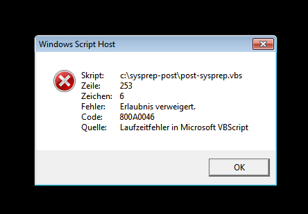 (In reply to comment #17) > Fehler beim Löschen der Hook Verzeichnisse werden nun übergangen, außerdem > wurde der "Lösch" Funktion noch der Parameter force ( == True) übergeben > > " The optional force parameter returns a Boolean value - True allows folders > with read-only attributes to be deleted, while False (default) does not. " > > Paket ist gebaut und in der Testumgebung installiert. Bitte damit noch testen. Ok, der Fehler wird an dieser Stelle nun übersprungen und der Sysprepvorgang wird erfolgreich zuende geführt. Bzgl. des Problems mit dem nicht ernfernbaren Ordner habe ich Bug #22425 erstellt.