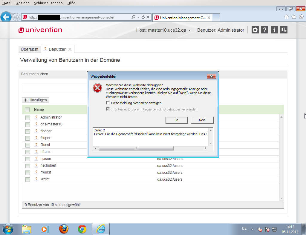(In reply to Alexander Kläser from comment #37) > More observations which are no blockers for now: > * Bug 33112 - [IE8] Wizard does not work > * Bug 33115 - Wizard is positioned incorrectly > * Bug 33116 - After creating a computer via the wizard, the field "name" is > marked as invalid > * Bug 33117 - [Android] No virtual keyboard when wizard opens / fixed height > needed Fixed in univention-management-console-module-udm 4.0.95-1.415.201311051759 > * Bug 33113 - [IE9] "Enter" on in wizard form does not work Not fixed. Not critical. Clever bug: hides from debugger! (In reply to Alexander Kläser from comment #39) > error (with an alert message) in IE9 when opening > the user wizard, choosing a template, going one page further, and then > closing the dialogue again. See screenshot. Cannot reproduce. RESOLVED for now