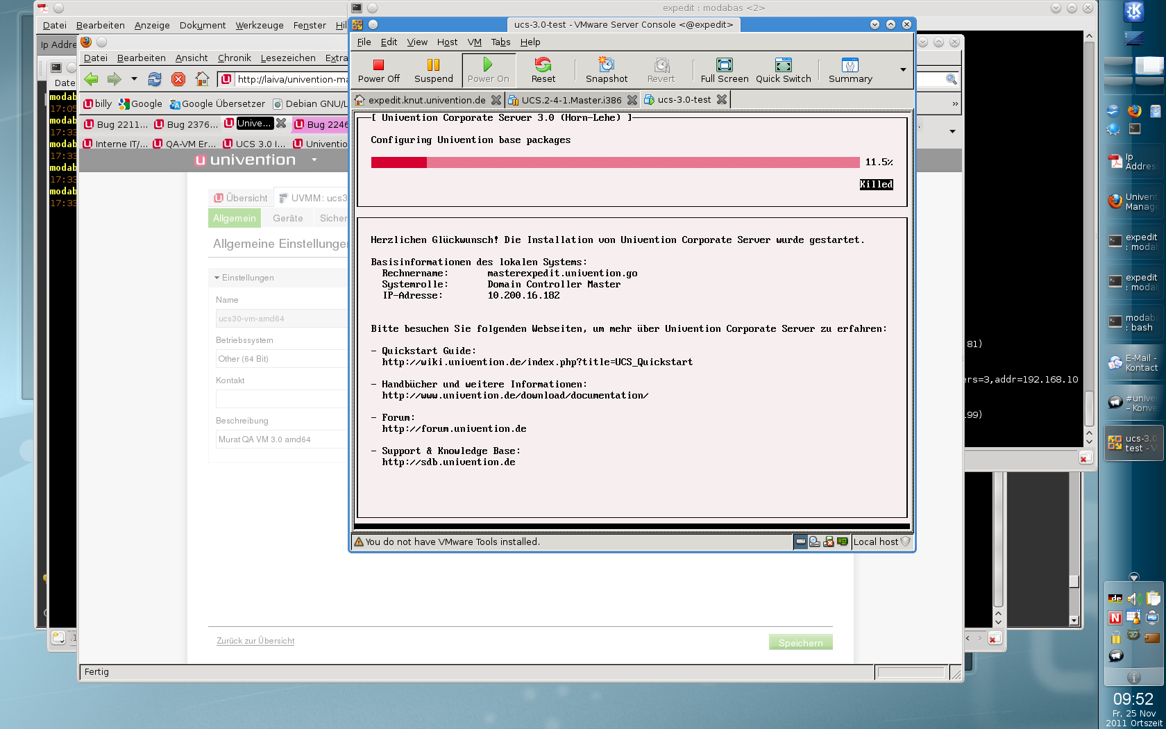 UCS 3.0 mit der Latest Version (ucs_3.0-0-20111124132826-dvd-i386.iso) kann auf VMWare-Server (expedit) und VMPlayer (Notebook) installiert werden. Kurzer Test mit Anmeldung, Firefox, Netzwerk funktionieren. Das einzige was aufgefallen ist, ist eine Meldung in der Instalations Darstellung des Installer, oben rechts in der Fortschritt Anzeige wird direkt nach dem Start in Schwarz "Killed" angezeigt. Dies betrifft den VMPlayer und VMServer, Screenshot häng anbei. Mit der 3.0 latest Version (ucs_3.0-0-20111124135012-dvd-amd64.iso) ist die Installation auf VMPlayer und VMServer (expedit und leksvik )nicht möglich. Nach der Auswahl "Univention Installer" bleibt der Bildschirm schwarz. VMWare ESX Versionen habe ich erstmal ausgelassen da die auch in den Produkttests QAed werden müssen??
