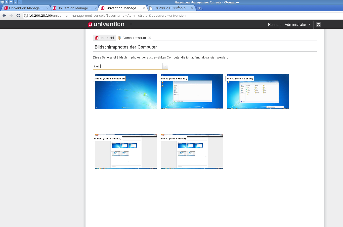 Created attachment 4386 [details] Screenshot: Computerraummodul Das "rauskicken" der anderen Lehrer funktioniert noch nicht richtig. Wie man im Screenshot sieht sind 3 unterschiedliche Benutzer auf 3 verschiedenen Rechnern im selben Computerraum und können die aktuellen Bildschirmfotos sehen. Keiner der Lehrer bekam einen "Raum wurde von anderem Lehrer übernommen"-Dialog.