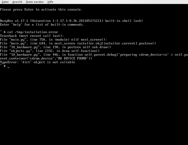 Egal ob auf dem Rechner (Schulungsraum) EFI-Boot aktiviert ist oder nichht, der Installer startet nicht. Es gibt (vor dem Start des Kernels?) die Meldung "error: file not found." Beim Start des Kernels gibt es dann einen Traceback (root fs wurde nicht gefunden)