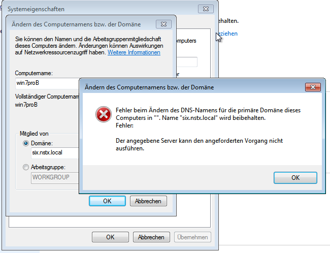 Hierzu gibt es einen Artikel in der Microsoft Knowledge Base [1]. Dies tritt auch auf, wenn ein Windows Client in eine Windows AD Domäne gejoint werden soll, sobald der Client und/oder der PDC nur IPv6 aktiviert hat. In diesem Fall schlägt eine Funktion am Ende des Domain Join fehl, welche den DNS-Suffix auf den neuen Domänennamen setzt. Zum Zeitpunkt des Aufrufs der Funktion ist der Join schon abgeschlossen und der DNS-Suffix wurde dabei schon richtig gesetzt. Aus diesem Grund hat der Fehler keine weiteren Auswirkungen. [2] Unter Windows 8 tritt diese Fehlermeldung nicht auf. [1] http://support.microsoft.com/kb/2018583 [2] http://blogs.technet.com/b/instan/archive/2012/01/14/changing-the-primary-domain-dns-name-of-this-computer-to-quot-quot-failed.aspx