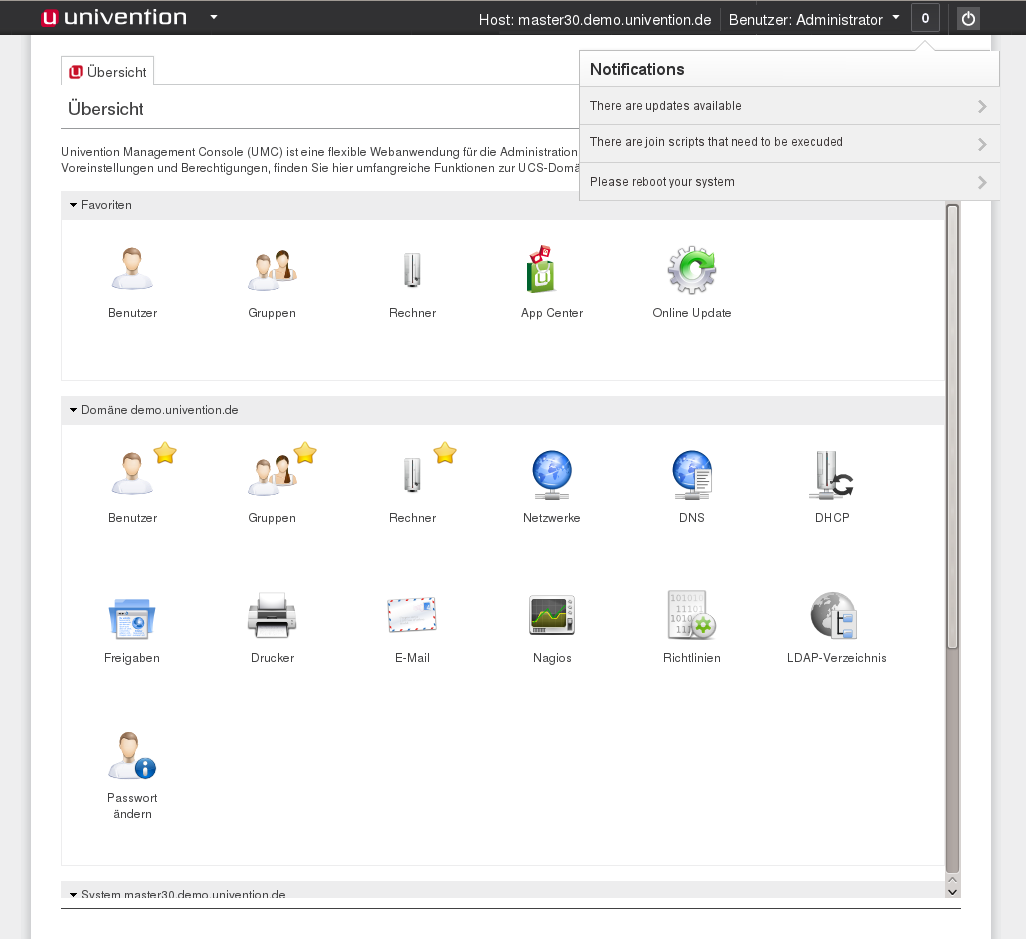 Created attachment 4975 [details] UMC with notifications sketch Currently, important system notifications are displayed on the UMC overview page. Attached is a sketch of how system notifications could be displayed. The number in the UMC menu bar indicates how many notifications are unread (displayed in red if >0). By clicking on the number, the sketched popup window would be displayed. Already seen notifications would be marked with a darker background.