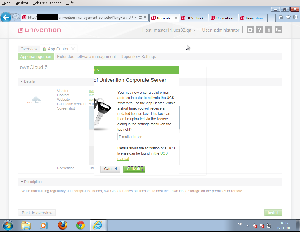 Created attachment 5569 [details] Screenshot Reproducible with IE9 and IE10 also when clicking on <settings menu>/<Activiation of UCS>. Other browsers seem to be ok.