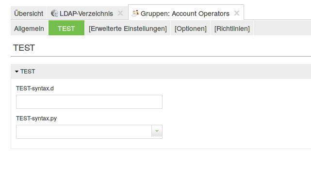 from univention.management.console.modules.udm import * set_bind_function(lambda lo: lo.bind('uid=Administrator,cn=users,dc=school,dc=local', 'univention')) group = UDM_Module('groups/group') props = group.properties a, b = [x for x in props if x['id'].startswith('TEST')] import univention print univention.admin.handlers.groups.group.property_descriptions['TEST-EXT'].syntax.name 'string'