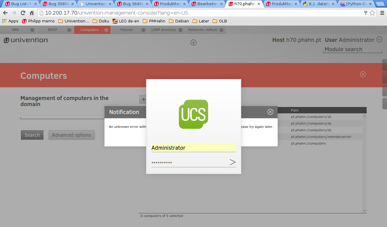 Let's use the bug for this problem. If the network is not reachable UMC displays 'unknown error'. We should enhance the error message. Please also check if the error message is wrong if apache is down.
