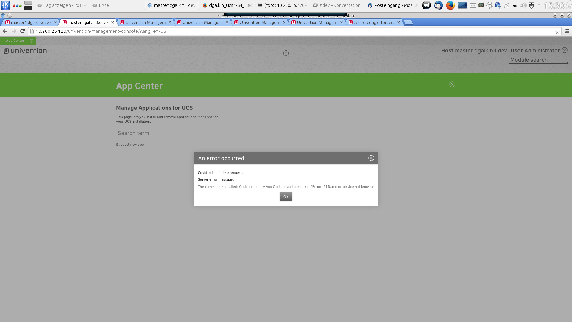 Created attachment 6376 [details] umc app center module The App center module in the UMC will pop up with an "Server error message" (see screen shot) if the network is mis-configured/not working/unreachable. The message is confusing at first -> like there is an App center server error (i.e. remote problem, not the actual local one).