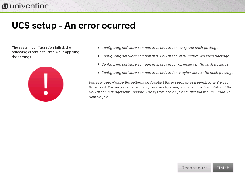 Here is the corresponding part from setup.log: === 50_software/10software (2014-11-19 06:29:29) === __NAME__:50_software/10software Configuring software components __STEPS__:600 __MSG__:Fetched 0 B in 0s (0 B/s) __STEP__:0 __STEP__:0 __ERR__:univention-dhcp: No such package __MSG__:Fetched 0 B in 0s (0 B/s) __STEP__:0 __ERR__:univention-mail-server: No such package __MSG__:Fetched 0 B in 0s (0 B/s) __STEP__:0 __ERR__:univention-printserver: No such package __MSG__:Fetched 0 B in 0s (0 B/s) __STEP__:0 __ERR__:univention-nagios-server: No such package __MSG__:Fetched 0 B in 0s (0 B/s) __STEP__:0 The problem seems that UCS4 has not been released yet, as apt tries to get the software components from updates.software-univention.de.