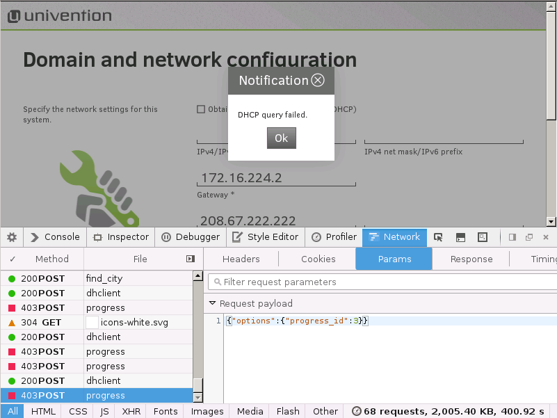 Created attachment 6427 [details] Screenshot See screenshot. The ACLs are correct: > root@unassigned-hostname:~# umc-acls show -u __systemsetup__ > loaded pickle file /var/cache/univention-management-console/acls/__systemsetup__ > Username: __systemsetup__ > Host: * Command: setup/* Flavor: wizard Options: {} > Host: * Command: lib/server/* Flavor: wizard Options: {} The module XML file is fine, as well. The problem here is that the progress command does not send the correct flavor (=wizard) along with the request.