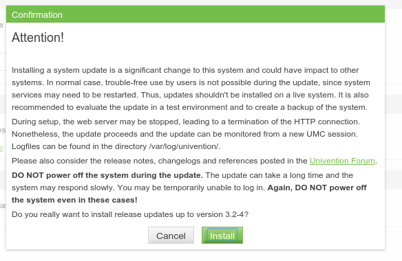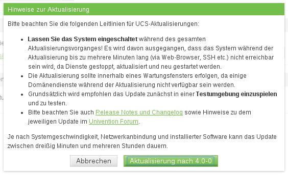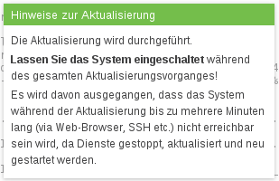 Currently, the warning messages in the Online updater module can be misleading. In turn, this might let one conclude that something is broken and the system should be restarted (which is obviously not a very good idea). * Apache might be down for a few minutes, if this happens, a popup is shown which suggests to login again after some time. Here it should rather be stated that a connection timeout is an expected behaviour during an update, the system must not be rebooted. * The alert message before executing the update needs to be shortened and it needs to state that a longer connection timeout (i.e., web server or SSH) is possible and that the system must not rebooted. * A link to the official release notes should be shown (currently it is the forum entry). * The link to the release notes could also be shown along with the warning message (2nd point) on the progress page.