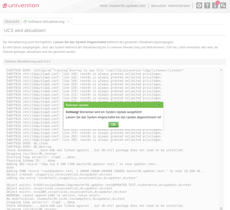 In order to avoid confusion upon malfunctions of UMC/UCS during updates, users need to be informed that an update is currently running. This can be done by an alert message box upon login, as well as - if possible -, periodically similar to the check whether UMC has been updated.
