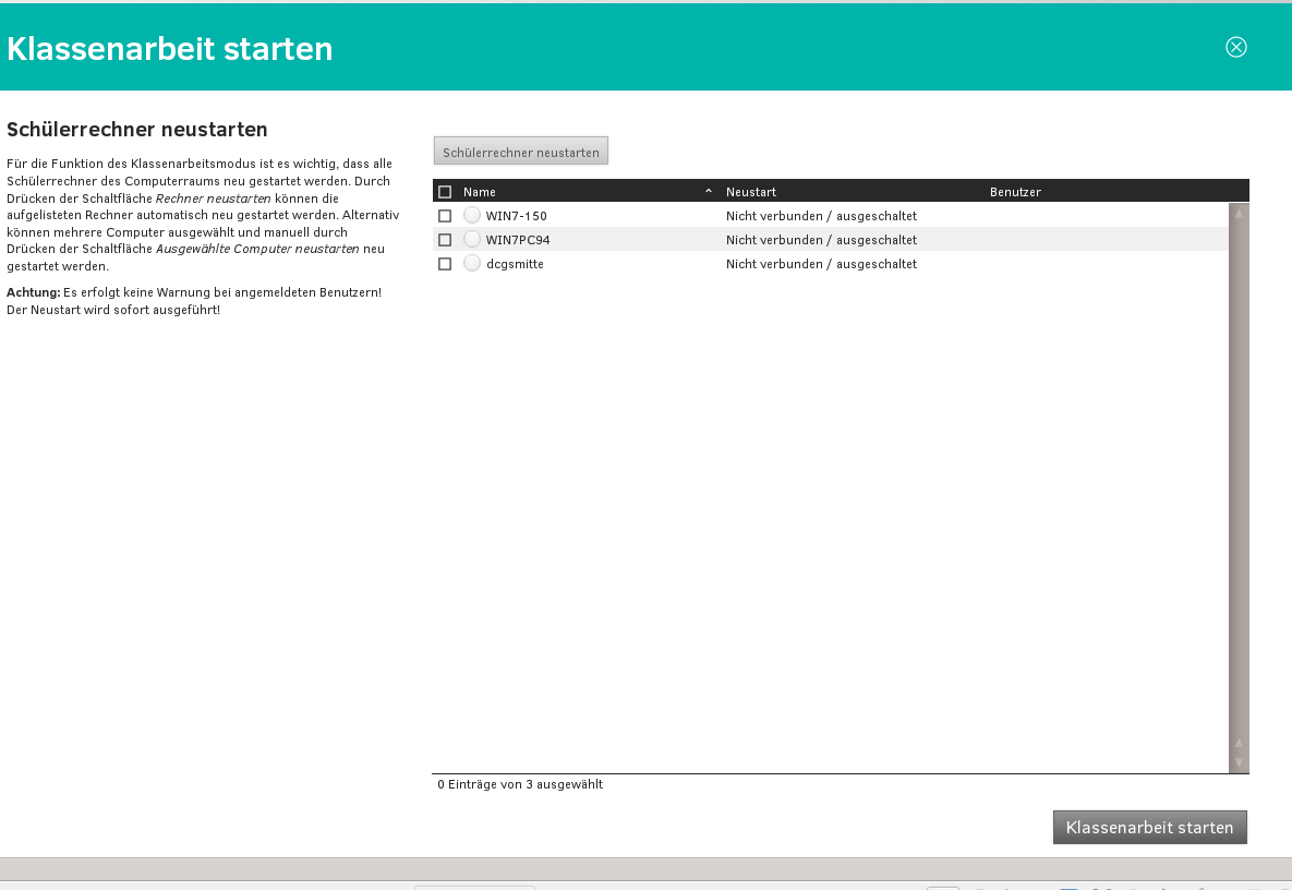 (In reply to Sönke Schwardt-Krummrich from comment #3) > 1) the grid shall be updated continuously implemented > 2) during the first 5 seconds, when switching to the reboot page, the page > shall be disabled via standby animation implemented > 3) there shall be 2 buttons ("next without restart" and "next with restart") > - both buttons shall present a confirmation dialog when clicked I added 2 grid buttons ('restart student computers', 'restart selected computers'). Then none of these actions were triggered the 'next' button asks again. > 4) currently there are only two states for computers "unreachable/offline" > or > "reboot required". For bug 38004 a third state "ignored/skipped" should > be > added. > A computer shall *not* be restarted (state "ignored/skipped") if > a) the current UMC user is logged on on that computer (use the browser's > IP > address; see automatic room selection code in computerroom) > b) a teacher is logged on on that computer (optional feature; add a UCR > variable to disable 4b) don't touched this, as it was already implemented. Teacher computers already have the 'not necessary' state. Fix: svn r59817, r59818 Package: ucs-school-umc-exam The following UCR variables have been removed: ucsschool/exam/delay/min ucsschool/exam/delay/max ucsschool/exam/delay/offset Still open because the next button is somehow not visible on Sönkes notebook: http://billy/~sschwardt/neustart1.png