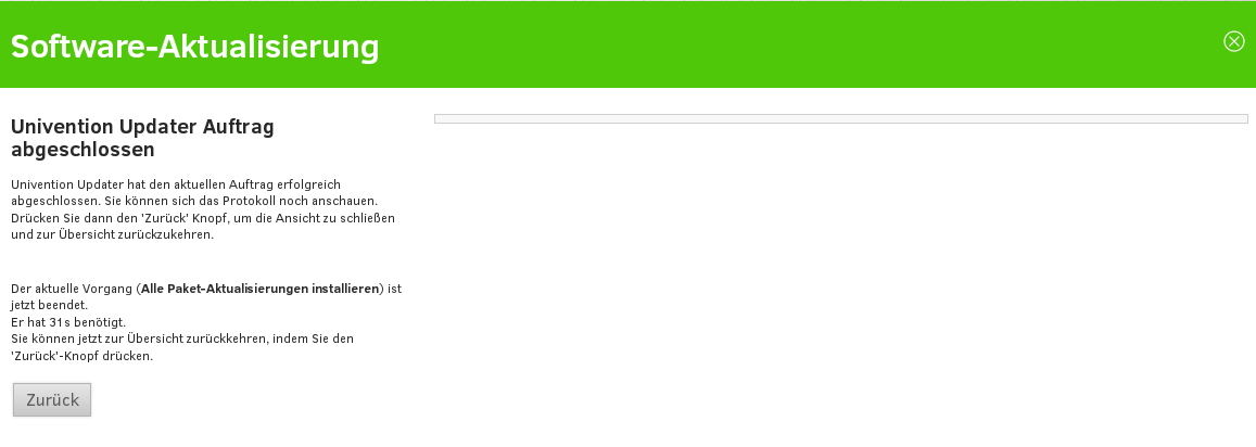 Happened to me, too. The update was running and finished correctly, but the UMC module only showed '... Protokolldatei wird geladen ...'. I was not notified after the update process was finished. switch_progress: Cannot read property 'set' of undefined Also happens with updater/installer/status returns: >> { '_status_': 'RUNNING', ...