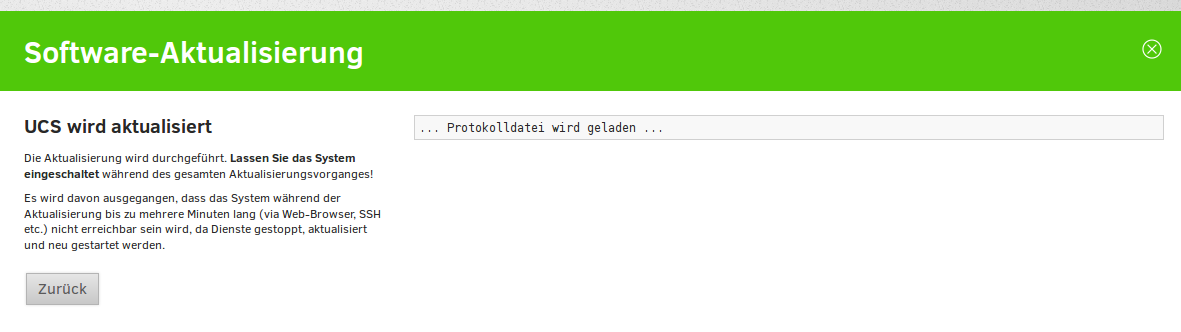 From time to time it sometimes happens that the updater module shows a blank logfile page containing only the text "... loading log file ...". This has to do with the UCS 4.0 changes. There are 2 javascript exceptions ProgressPage.js: (startWatching()) this._pane.set('title', _('Updating...')); (_process_job_status) this._pane.set('title', this._last_job.label); → this._pane is undefined The logfile contains this for the command updater/installer/status: updater/installer/status returns: >> { '_status_': 'FAILED', >> 'command': '/usr/share/univention-updater/univention-updater-umc-dist-upgrade; /usr/share/univention-updater/univention-updater-check', >> 'detail': '', >> 'elapsed': '0s', >> 'job': 'distupgrade', >> 'label': 'Package update', >> 'lines': 132, >> 'logfile': '/var/log/univention/updater.log', >> 'purpose': 'Package update', >> 'reboot': False, >> 'running': False, >> 'started': 1420981923, >> 'statusfile': '/var/lib/univention-updater/umc-dist-upgrade.status', >> 'time': 1420981923}