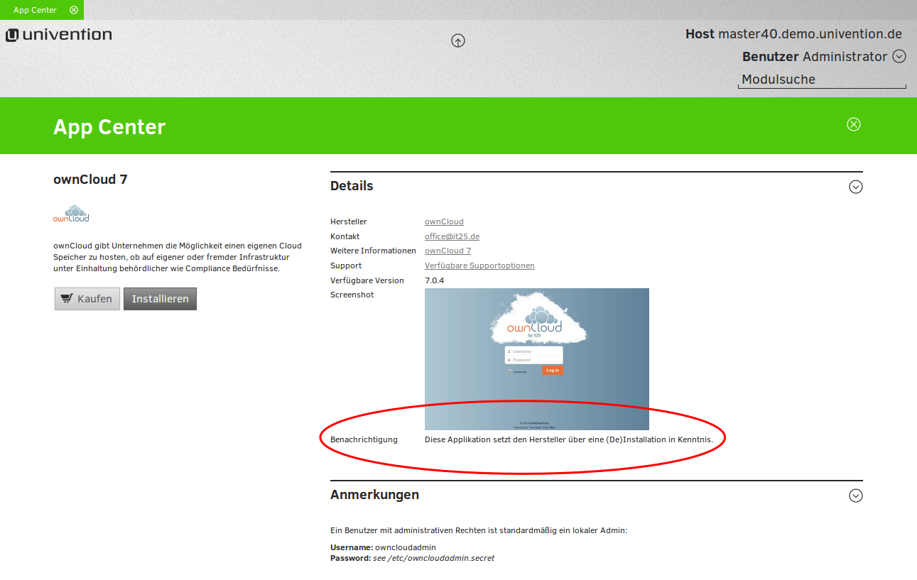Created attachment 6624 [details] See screenshot Feedback from the App Center Expert Talk at Univention Summit 2015. In the App Center UMC module, a user can read on the app detail's page that a notification will be sent to the vendor, if the vendor wants such a notification (see the screenshot attached). The ISVs criticized that the text is not explizit enough. It misses: * Who is the "vendor". Univention or the app vendor? * It does not say that the vendor may contact the user. I suggest to change the text here to the following: DE: "Diese Applikation setzt den App-Hersteller über eine (De)Installation in Kenntnis. Der App-Hersteller wird Sie ggf. kontaktieren." EN: "This application will inform the app vendor if you (un)install it. The app vendor may contact you."