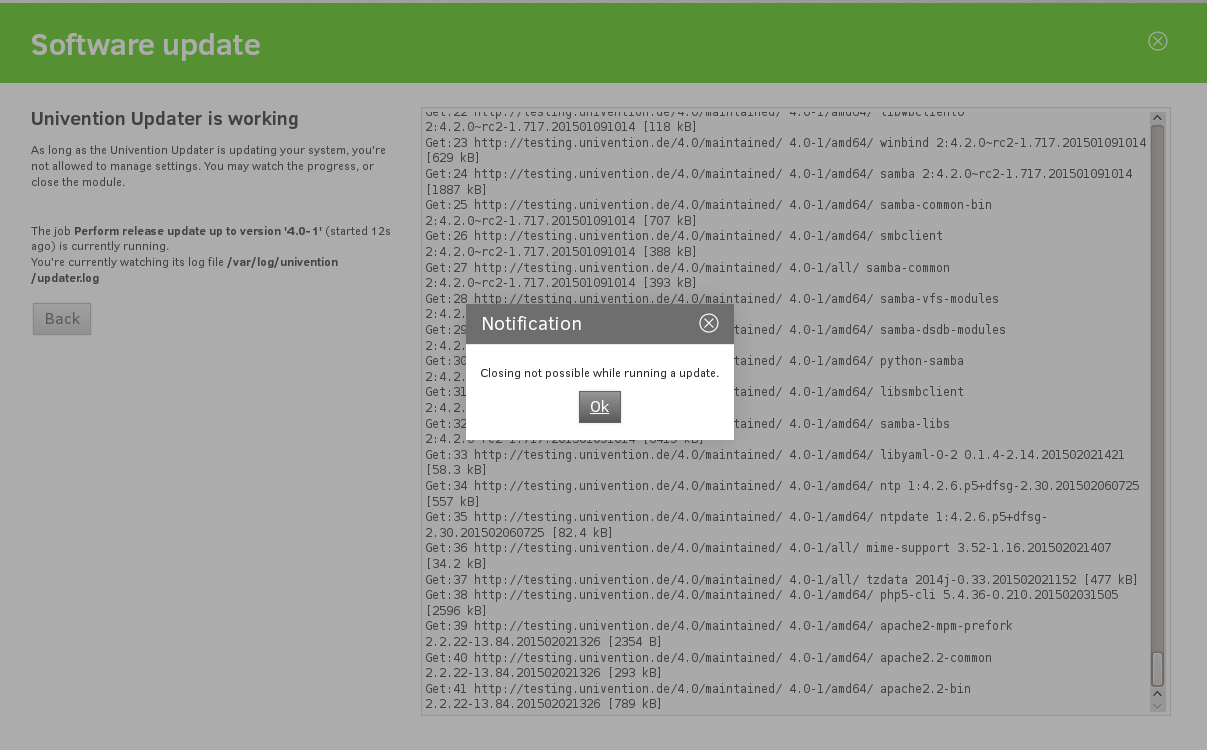 The back button is now hidden during upgrades. After the update is finished it is shown again. Fix: svn r57944 YAML: 2015-02-10-univention-updater.yaml