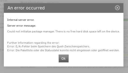 This similar traceback has been reported: Traceback (most recent call last): File "%PY2.7%/univention/management/console/protocol/modserver.py", line 266, in handle self.__handler.init() File "%PY2.7%/univention/management/console/modules/appcenter/__init__.py", line 86, in init lock=False, File "%PY2.7%/univention/lib/package_manager.py", line 264, in __init__ self.cache = apt.Cache() File "/usr/lib/python2.7/dist-packages/apt/cache.py", line 102, in __init__ self.open(progress) File "/usr/lib/python2.7/dist-packages/apt/cache.py", line 145, in open self._cache = apt_pkg.Cache(progress) SystemError: W:Datei >>20_ucs-online-component.list.old<< in Verzeichnis >>/etc/apt/sources.list.d/<< wird ignoriert, da sie eine ung?ltige Dateinamen-Erweiterung hat., E:Schreibfehler - write (28: Auf dem Ger?t ist kein Speicherplatz mehr verf?gbar), E:E/A-Fehler beim Speichern des Quell-Zwischenspeichers, E:Die Paketliste oder die Statusdatei konnte nicht eingelesen oder ge?ffnet werden. Remark: Beim Installieren von zusätzlichen App (Software) Paketen ist dieser Fehler aufgetreten. Version: 4.0-1 errata142 (Walle)