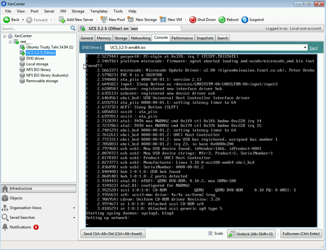 Created attachment 6794 [details] Xencenter screenshot UCS 3.2-5 in a XenServer 6.5 fails to show the Univention Installer screen (after grub menu). Instead, it hangs right after showing "Setting up network:" (See attachment) The cursor keeps blinking but it wouldn't show anything. After several minutes of wait one can send a ctr-alt-del and the system will take the order and reboot.