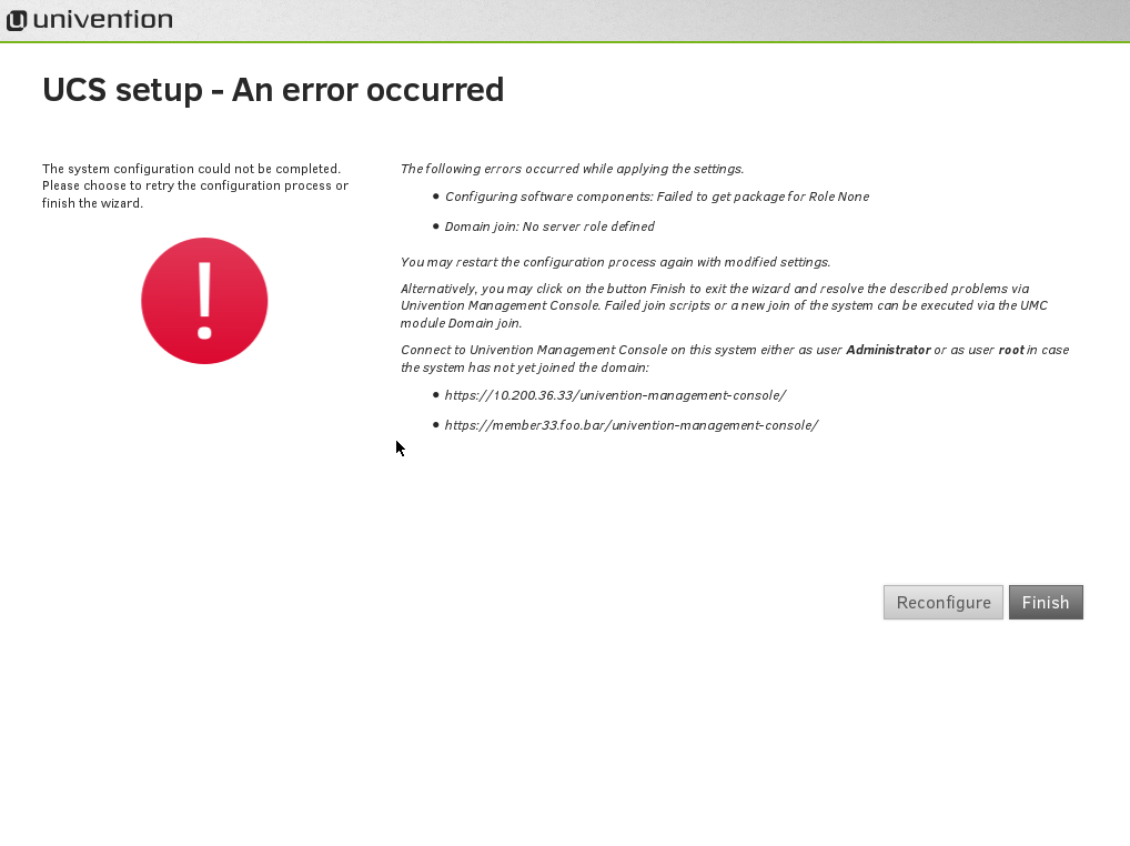 I reproduced this error with the current 4.0-2 DVD: ucs_4.0-2-20150512-081431-dvd-amd64.iso 1) advanced options 2) textmode 3) english 4) english gb --> after the reboot you will get bug #38512 5) switched the lang from eng gb to gb and used bremen as my city of choice --> this will set the keyboard and locales to de_DE 6) joined the domain as member 7) picked no software 8) deselected updates at the end i got the same error, see Screenshot join error additional infos: - i used dhcp for the network - and i was able to reproduce this bug with role slave