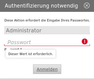 OK: In my opinion, the default text is understandable now ("Diese Aktion erfordert die Eingabe Ihres Passwortes") Reopen: The text after entering a wrong password could be improved: "Authentisierung ist fehlgeschlagen. Bitte melden Sie sich erneut an" -> "Authentisierung ist fehlgeschlagen. Bitte geben Sie das korrekte Passwort ein" OK: Clicking Cancel aborts the action RFC: I am unsure about the current behavior: If the password was entered, it is cached and subsequent actions do not require to enter the password again.