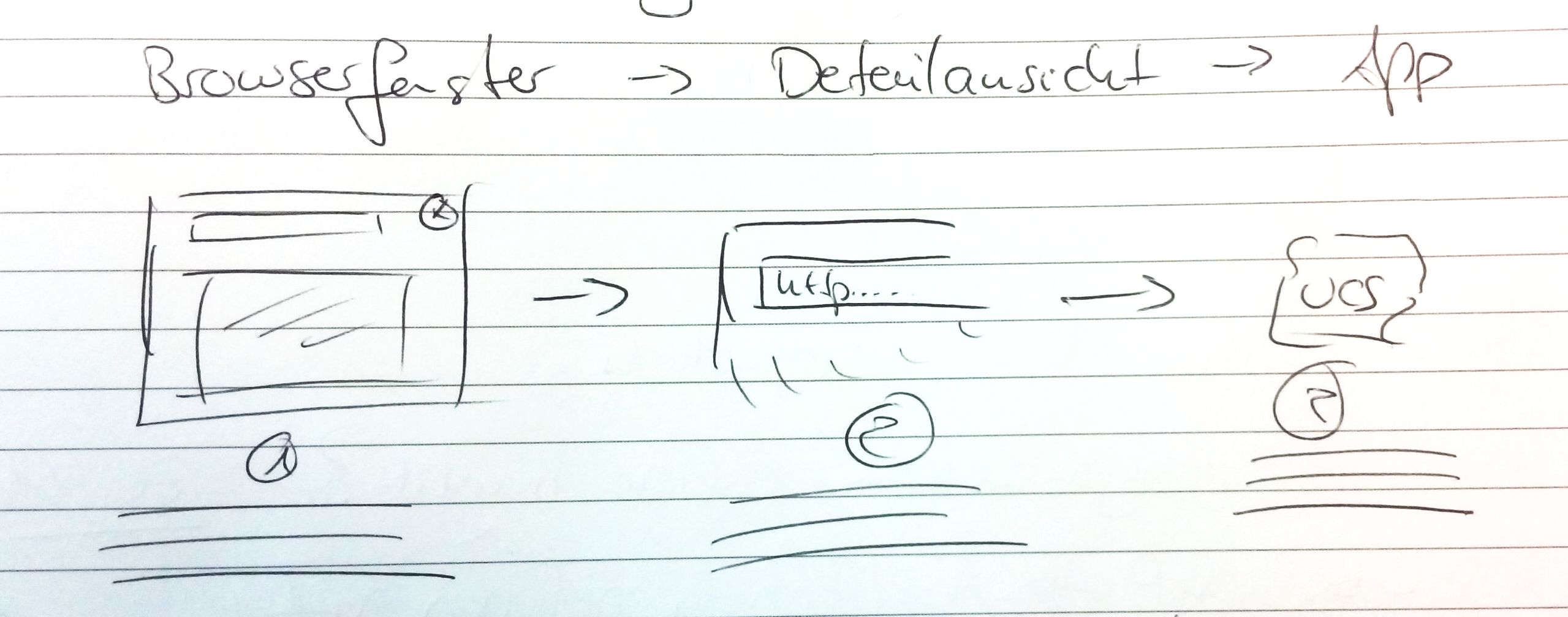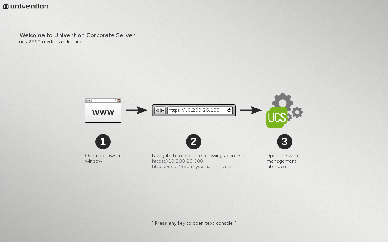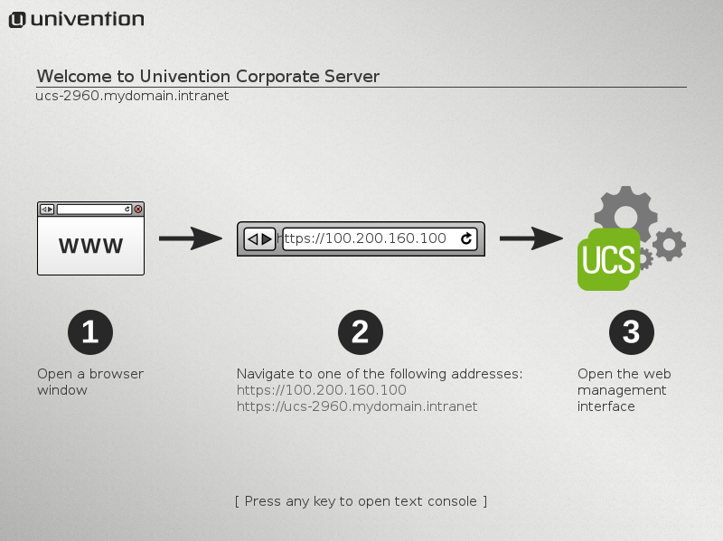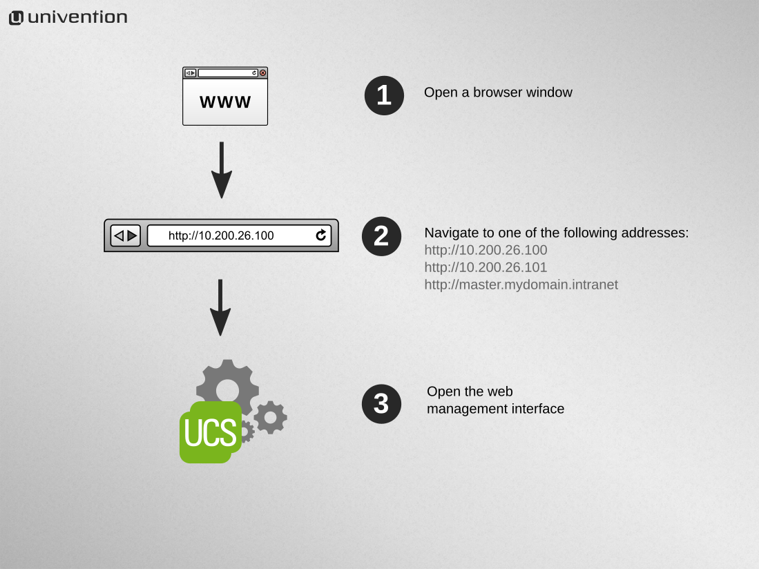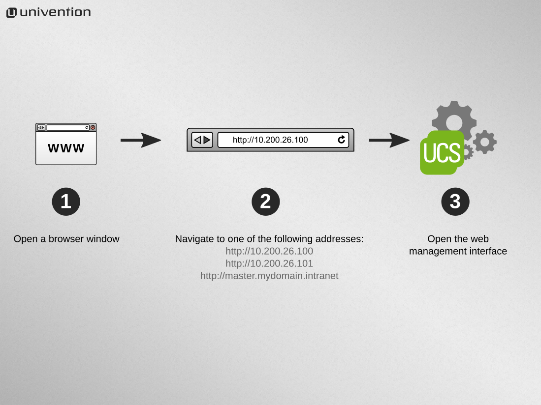 See Bug 39235, comment #2, the current design needs to be adapted and should be done within the scope of this bug: > Created attachment 7219 [details] > Sketch > > A few ideas for an improvement (cf. attached sketch): > * Use simple, straight arrows instead of curved, dynamic ones. This will > better > suggest that the graphic is a schematic procedure. > * For an Univention App appliance: Replace the UMC icon with the app icon. > * The current graphics are too realistic, it would help to understand the > schematic procedure with stylized graphics: > 1. Use a stylized browser window, e.g.: > http://www.freepik.com/free-photos-vectors/browser-window > 2. Use a zoomed in version of the browser window, only show the upper left > corner along with the address bar and cut off (or fade out) the rest. > 3. Use the UMC/App icon for the last step > * Each step could be accompanied by large numbers (1, 2, 3) as well as some > explanatory text below.