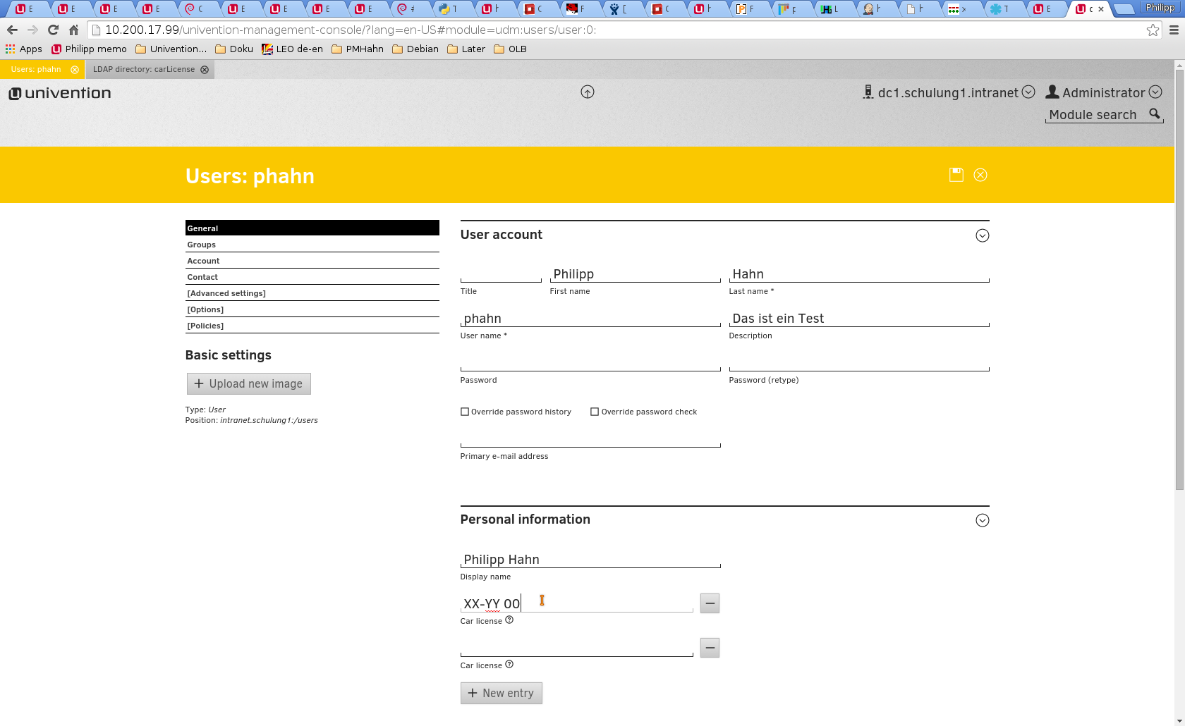 Created attachment 7160 [details] UMC Screenshot # univention-ldapsearch -LLLb "cn=carLicense,cn=custom attributes,cn=univention,dc=schulung1,dc=intranet" -o ldif-wrap=no dn: cn=carLicense,cn=custom attributes,cn=univention,dc=schulung1,dc=intranet cn: carLicense objectClass: top objectClass: univentionUDMProperty objectClass: univentionObject univentionUDMPropertyModule: users/user univentionUDMPropertyLayoutTabName: General univentionUDMPropertyLongDescription: Private car license univentionUDMPropertyLdapMapping: univentionFreeAttribute1 univentionUDMPropertyObjectClass: univentionFreeAttributes univentionUDMPropertyLayoutGroupName: Personal information univentionUDMPropertyLayoutTabAdvanced: 0 univentionUDMPropertyValueNotEditable: 0 univentionUDMPropertyLayoutOverwriteTab: 0 univentionUDMPropertyLayoutDisable: 0 univentionUDMPropertyTranslationTabName;entry-de-de: Allgemein univentionUDMPropertyDoNotSearch: 0 univentionUDMPropertyTranslationShortDescription;entry-de-de: Autokennzeichen univentionUDMPropertySyntax: string univentionUDMPropertyLayoutPosition: 2 univentionUDMPropertyMultivalue: 1 univentionUDMPropertyDeleteObjectClass: 0 univentionUDMPropertyDefault: HB-XX 0000 univentionUDMPropertyValueMayChange: 1 univentionUDMPropertyTranslationGroupName;entry-de-de:: UGVyc8O2bmxpY2hlIEluZm9ybWF0aW9uZW4= univentionUDMPropertyShortDescription: Car license univentionObjectType: settings/extended_attribute univentionUDMPropertyTranslationLongDescription;entry-de-de: Kennzeichen des privaten PKW univentionUDMPropertyOptions: person univentionUDMPropertyVersion: 2 univentionUDMPropertyValueRequired: 0 univentionUDMPropertyCLIName: carLicense univentionUDMPropertyLayoutFullWidth: 0 is not displayed in the right column (univentionUDMPropertyLayoutPosition=2) UCS Technical training Issue 2090