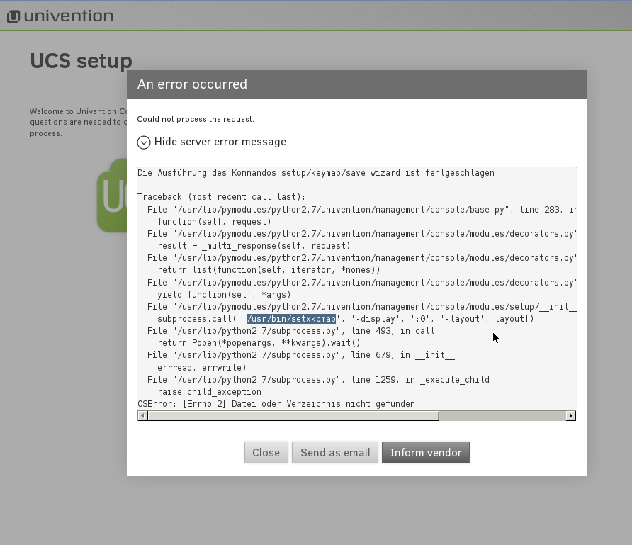 Die Ausführung des Kommandos setup/keymap/save wizard ist fehlgeschlagen: Traceback (most recent call last): File "/usr/lib/pymodules/python2.7/univention/management/console/base.py", line 283, in execute function(self, request) File "/usr/lib/pymodules/python2.7/univention/management/console/modules/decorators.py", line 318, in _response result = _multi_response(self, request) File "/usr/lib/pymodules/python2.7/univention/management/console/modules/decorators.py", line 462, in _response return list(function(self, iterator, *nones)) File "/usr/lib/pymodules/python2.7/univention/management/console/modules/decorators.py", line 284, in _fake_func yield function(self, *args) File "/usr/lib/pymodules/python2.7/univention/management/console/modules/setup/__init__.py", line 165, in save_keymap subprocess.call(['/usr/bin/setxkbmap', '-display', ':0', '-layout', layout]) File "/usr/lib/python2.7/subprocess.py", line 493, in call return Popen(*popenargs, **kwargs).wait() File "/usr/lib/python2.7/subprocess.py", line 679, in __init__ errread, errwrite) File "/usr/lib/python2.7/subprocess.py", line 1259, in _execute_child raise child_exception OSError: [Errno 2] Datei oder Verzeichnis nicht gefunden
