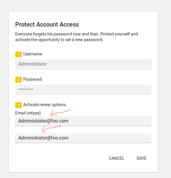 (In reply to Florian Best from comment #25) > Created attachment 8595 [details] > Screenshot > > The label for "E-Mail" is missing and the label for "E-Mail (wiederholen)" > is at the wrong place. I think the idea was that the label is for both fields. But afaik we are not using a design like that anywhere else. I changed it. r78028: separate labels for first input and retype input Package: univention-self-service Version: 2.0.10-5A~4.2.0.201703211148 Branch: ucs_4.2-0