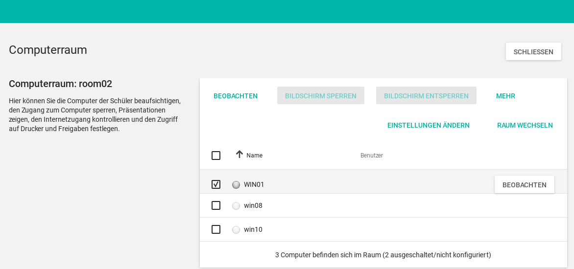 (In reply to Florian Best from comment #8) > The detection of the connected state doesn't work sometimes. ucs-school-umc-computerroom (9.0.6-4): r77711 | Bug #43575: preserve previous selection when updating grid r77701 | Bug #43575: fix grid content updating (In reply to Florian Best from comment #7) > Created attachment 8528 [details] > Screenshot > > REOPEN: Screenshot-Tooltips aren't shown anymore and the button is not > styled nice. This was fixed more generic in univention-web-js.