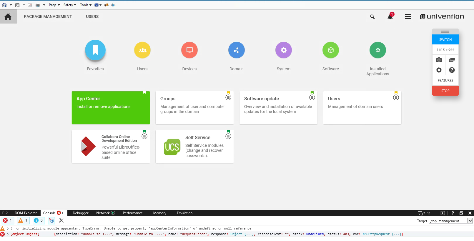 Created attachment 9212 [details] App Center cannot be opened in IE11 I could not open the App Center module in IE11 (Win10) as some JS error occurred.