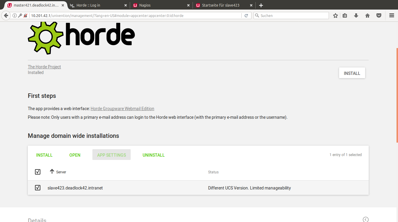 I've installed Horde on a DC Slave. On the Master, the App Center shows the status: "Different UCS version. Limited manageability". DC Master and DC Slave are installed with UCS 4.2.