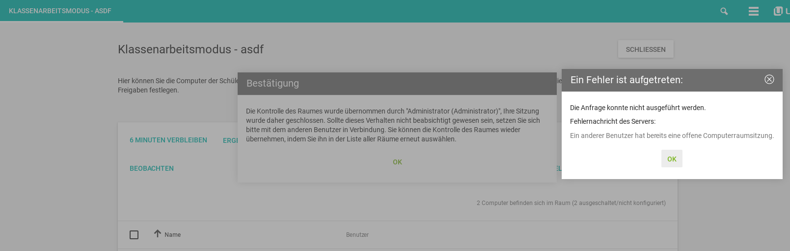 I found the synthesis of both solutions and moved the logic into the backend. All other changes have been reverted. ucs-school-umc-exam.yaml: r79976 | YAML Bug #44109 r79974 | Bug #44109: revert ucs-school-umc-computerroom (9.0.7-1): r79975 | Bug #44109: fix unsetting of computerroom settings after exam mode ucs-school-umc-computerroom.yaml: r79976 | YAML Bug #44109