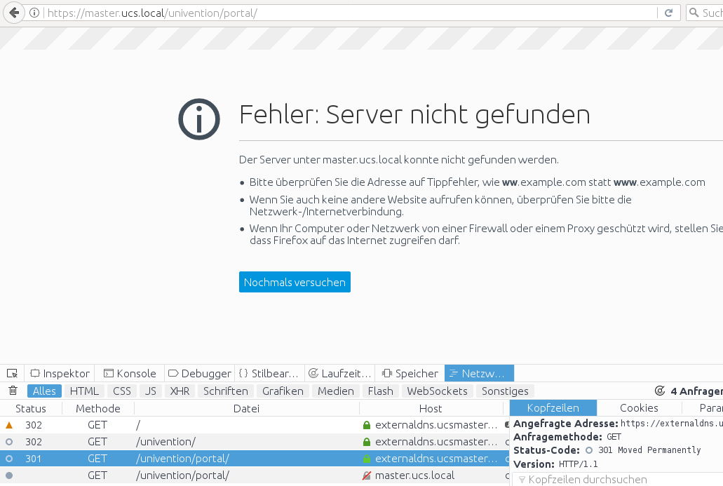 Okay, the redirect seems to be here: [Wed Mar 29 13:07:18.890775 2017] [rewrite:trace2] [pid 3548] mod_rewrite.c(475): [client 10.205.1.206:47094] 10.205.1.206 - - [foobar/sid#7f3c3292f540][rid#7f3c328610a0/initial] init rewrite engine with requested uri /univention/portal/ [Wed Mar 29 13:07:18.890802 2017] [rewrite:trace3] [pid 3548] mod_rewrite.c(475): [client 10.205.1.206:47094] 10.205.1.206 - - [foobar/sid#7f3c3292f540][rid#7f3c328610a0/initial] applying pattern '^/univention/setup/' to uri '/univention/portal/' [Wed Mar 29 13:07:18.890838 2017] [rewrite:trace3] [pid 3548] mod_rewrite.c(475): [client 10.205.1.206:47094] 10.205.1.206 - - [foobar/sid#7f3c3292f540][rid#7f3c328610a0/initial] applying pattern '^/?simplesamlphp/(.*)' to uri '/univention/portal/' [Wed Mar 29 13:07:18.890870 2017] [rewrite:trace3] [pid 3548] mod_rewrite.c(475): [client 10.205.1.206:47094] 10.205.1.206 - - [foobar/sid#7f3c3292f540][rid#7f3c328610a0/initial] applying pattern '.*' to uri '/univention/portal/' [Wed Mar 29 13:07:18.890909 2017] [rewrite:trace4] [pid 3548] mod_rewrite.c(475): [client 10.205.1.206:47094] 10.205.1.206 - - [foobar/sid#7f3c3292f540][rid#7f3c328610a0/initial] RewriteCond: input='/univention/portal/' pattern='^/univention/js/.*/i18n/[^/]*/.*\\.json' => not-matched [Wed Mar 29 13:07:18.890936 2017] [rewrite:trace4] [pid 3548] mod_rewrite.c(475): [client 10.205.1.206:47094] 10.205.1.206 - - [foobar/sid#7f3c3292f540][rid#7f3c328610a0/initial] RewriteCond: input='/univention/portal/' pattern='^/univention/management/modules/i18n/[^/]*/.*\\.json' => not-matched [Wed Mar 29 13:07:18.890961 2017] [rewrite:trace4] [pid 3548] mod_rewrite.c(475): [client 10.205.1.206:47094] 10.205.1.206 - - [foobar/sid#7f3c3292f540][rid#7f3c328610a0/initial] RewriteCond: input='/univention/portal/' pattern='^/univention/i18n/[^/]*/.*\\.json' => not-matched [Wed Mar 29 13:07:18.890989 2017] [rewrite:trace4] [pid 3548] mod_rewrite.c(475): [client 10.205.1.206:47094] 10.205.1.206 - - [foobar/sid#7f3c3292f540][rid#7f3c328610a0/initial] RewriteCond: input='/univention/portal/' pattern='^/univention/(management|portal|login|server-overview|self-service|setup)/i18n/[^/]*/.*\\.json' => not-matched [Wed Mar 29 13:07:18.891011 2017] [rewrite:trace3] [pid 3548] mod_rewrite.c(475): [client 10.205.1.206:47094] 10.205.1.206 - - [foobar/sid#7f3c3292f540][rid#7f3c328610a0/initial] applying pattern '^/univention/(.*)$' to uri '/univention/portal/' [Wed Mar 29 13:07:18.891054 2017] [rewrite:trace4] [pid 3548] mod_rewrite.c(475): [client 10.205.1.206:47094] 10.205.1.206 - - [foobar/sid#7f3c3292f540][rid#7f3c328610a0/initial] RewriteCond: input='foobar' pattern='^foobar$' => matched [Wed Mar 29 13:07:18.891079 2017] [rewrite:trace4] [pid 3548] mod_rewrite.c(475): [client 10.205.1.206:47094] 10.205.1.206 - - [foobar/sid#7f3c3292f540][rid#7f3c328610a0/initial] RewriteCond: input='/univention/portal/' pattern='^/univention/(login|management|self-service|portal|server-overview)/$' => matched [Wed Mar 29 13:07:18.891100 2017] [rewrite:trace2] [pid 3548] mod_rewrite.c(475): [client 10.205.1.206:47094] 10.205.1.206 - - [foobar/sid#7f3c3292f540][rid#7f3c328610a0/initial] rewrite '/univention/portal/' -> 'http://xen3.school.local/univention/portal/' [Wed Mar 29 13:07:18.891138 2017] [rewrite:trace2] [pid 3548] mod_rewrite.c(475): [client 10.205.1.206:47094] 10.205.1.206 - - [foobar/sid#7f3c3292f540][rid#7f3c328610a0/initial] explicitly forcing redirect with http://xen3.school.local/univention/portal/ [Wed Mar 29 13:07:18.891157 2017] [rewrite:trace8] [pid 3548] mod_rewrite.c(475): [client 10.205.1.206:47094] 10.205.1.206 - - [foobar/sid#7f3c3292f540][rid#7f3c328610a0/initial] Rule has END flag, no further rewriting for this request [Wed Mar 29 13:07:18.891177 2017] [rewrite:trace1] [pid 3548] mod_rewrite.c(475): [client 10.205.1.206:47094] 10.205.1.206 - - [foobar/sid#7f3c3292f540][rid#7f3c328610a0/initial] escaping http://xen3.school.local/univention/portal/ for redirect [Wed Mar 29 13:07:18.891197 2017] [rewrite:trace1] [pid 3548] mod_rewrite.c(475): [client 10.205.1.206:47094] 10.205.1.206 - - [foobar/sid#7f3c3292f540][rid#7f3c328610a0/initial] redirect to http://xen3.school.local/univention/portal/ [REDIRECT/301]