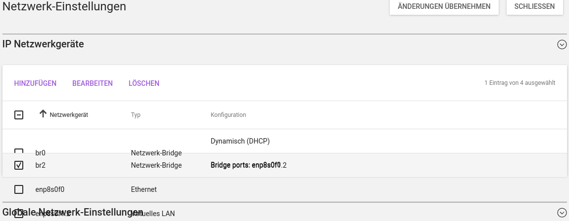 Created attachment 8879 [details] UMC screen shot 1. The interface list looks very broken 2. Configuring a 2nd Bridge→VLAN→eth1 interface failed: >Die folgenden Änderungen werden auf das System übertragen: > >Netzwerkgeräte: <ul><li>Erstellt:<ul><li>enp8s0f1.2 (Virtuelles LAN): Unkonfiguriert</li><li>br2 (Netzwerk-Bridge): Bridge ports: enp8s0f1.2</li></ul></li></li></ul> >Bitte bestätigen Sie, dass diese Änderungen auf das System übertragen werden. Dies kann einige Zeit in Anspruch nehmen 3. Note the <html> tags The CLI equivalent succeeded: ucr set \ interfaces/enp8s0f1/{type=manual,start=true,order=1} \ interfaces/enp8s0f1.42/{type=manual,start=true,order=2} \ interfaces/br42/{type=manual,start=true,order=3,options/{0='bridge_fd 0',1='bridge_ports enp8s0f1.42'}} The system is using <https://www.freedesktop.org/wiki/Software/systemd/PredictableNetworkInterfaceNames/>