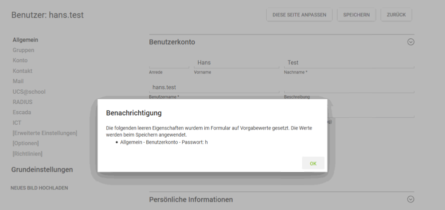 The problem is in _notifyAboutAutomaticChanges() in ucs-4.2-2/management/univention-management-console-module-udm/umc/js/udm/DetailPage.js where "changes" will be shown with: dialog.alert(_('The following empty properties were set to default values in the form. These values will be applied when saving.') + changes) "changes" must be cleaned of clear text passwords.