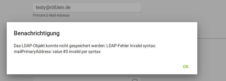 Since 2003 (IDNA2003; RFC 3490) special characters (like Umlauts) can be used in domain names. In 2008 (IDNA2008/IDNAbis; RFC 5890, RFC 5891, RFC 5892, RFC 5893, RFC 5894) the possibilities were even extended. By this a domain like 'rößlein.de' is possible. In UCS/UMC you can create such a maildomain but when trying to create a users mail-address - the local part is without special chars - you'll receive an error saying: "invalid syntax". I'm not sure if this is only an udm problem but from my point of view, openLDAP and bind9 are ok with IDN-domains. We should check postfix, samba/AD as well as udm so that UCS can handle these new abilities.