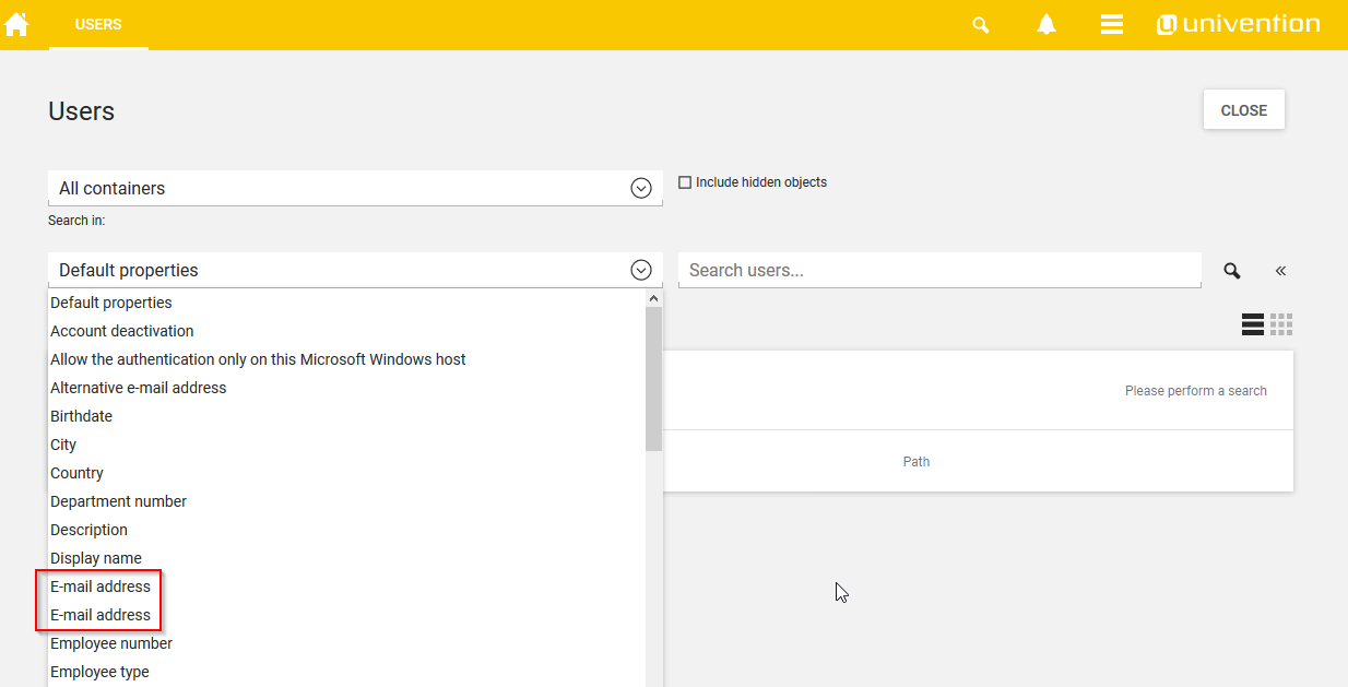 Created attachment 9350 [details] Screenshot of user module Currently we have TWO attributes that are named "E-mail address" in UMC - univentionPasswordSelfServiceEmail - mail The problem is that this creates a "double" entry in the property dropdown of the advanced search (see attached screenshot) and you never know which one is which (besides the fact that it's really confusing for customers). Not sure about the bug component, please adjust if necessary.