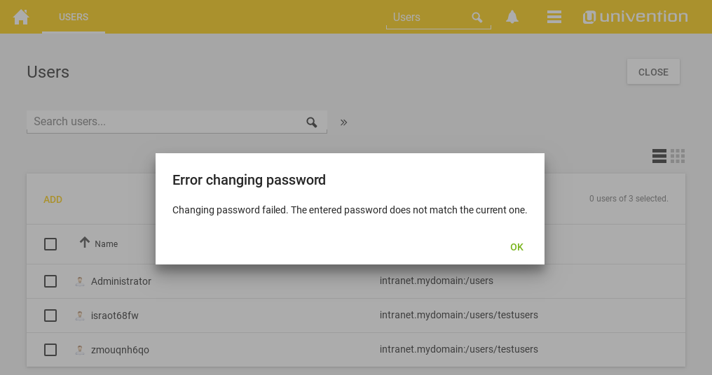 Jan 26 02:28:03 ucs-2980 python2.7: pam_unix(univention-management-console:auth): authentication failure; logname= uid=0 euid=0 tty= ruser= rhost= user=test2 Jan 26 02:28:03 ucs-2980 python2.7: pam_krb5(univention-management-console:auth): authentication failure; logname=test2 uid=0 euid=0 tty= ruser= rhost= Jan 26 02:28:03 ucs-2980 python2.7: pam_unix(univention-management-console:chauthtok): user "test2" does not exist in /etc/passwd It seems like the problem does not have to do with passwords that much, but with authentification in general