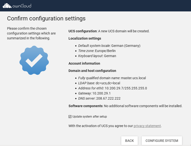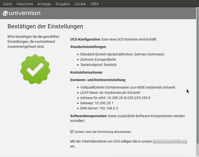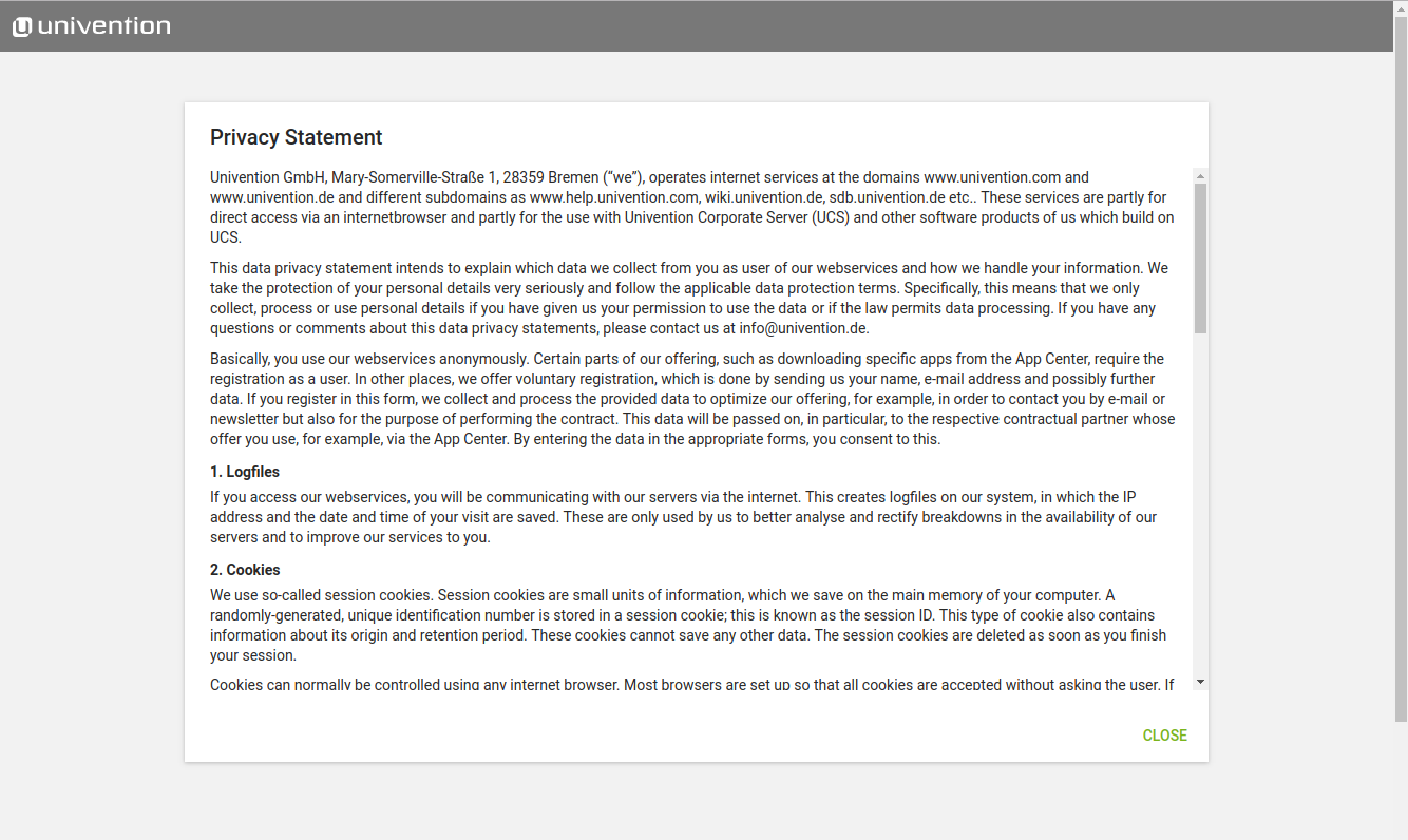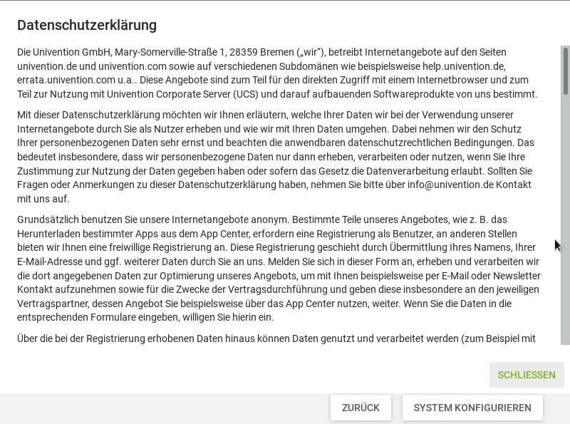 The current implementation looks way better than before, thanks. I found one more useability issue, REOPENing.. The popup displaying the privacy statement is shown for the display height, not the site height. This creates an issue with our UCS appliance: The default screen resolution in our appliances is 800x600. On the last page, the page height can be more than the display height, e.g. some additional software was selected during system setup. Due to longer sentences in german, there is always a scrollbar shown. If i now scroll down to see the 'start setup' and 'back' buttons and then click the privacy statement link, the buttons on the bottom stay visible. I can click on 'back' and 'start setup' while the popup is still visible. See screenshots. The popup should cover the display area, regardless of where the user is on the page vertically.