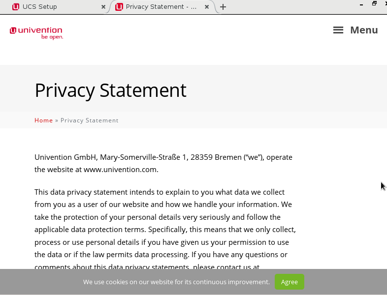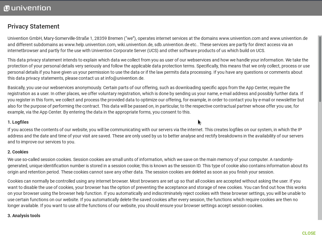 Created attachment 9505 [details] Link shown on last system setup page With Bug #46742 System Setup was modified and now shows a link to the Univention privacy statement. I see several useability issues with current implementation: * An internet connection is required, because the privacy statement is shown on the univention website (https://www.univention.com/privacy-statement/). I would expect that the statement is shown from a local source. * A new Tab is opened in the system-setup browser session. When installing UCS, the user is shown no indication that a browser is used. Now, when clicking the link, we show two tabs, see screenshots. This is highly irritating to me and no good useability imho. Also, there is the possitility for the user to shutdown the browser by clicking (x) in the top right corner or to close the System Setup running in the other tab. One would have to restart UCS to get system-setup back. DVD installs will start downloading packages for appliance mode. * Once the user scrolls down on the privacy statement page, the tabs disappear, see screenshot. CTRL+W closes the browser tab, or when moving the mouse to the top, the tabs reappear. There is no obvious mechanism to get back to system setup. Users may simply stop at this point. I would suggest to rework the privacy statement display, and maybe show a popup with the text loaded from a local source.