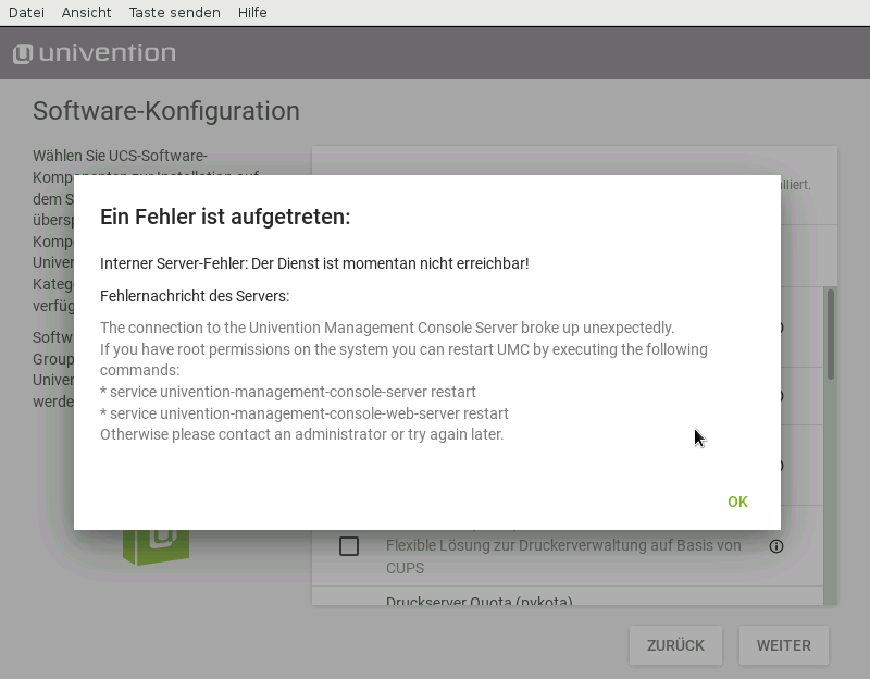 I don't really understand the situation: You are on the software selection page. Didn't you do anything there for a long time? This message comes when the UMC-WebServer connection to the UMC-Server breaks (e.g. because the UMC-Server restarts or crashes). Log files would help.