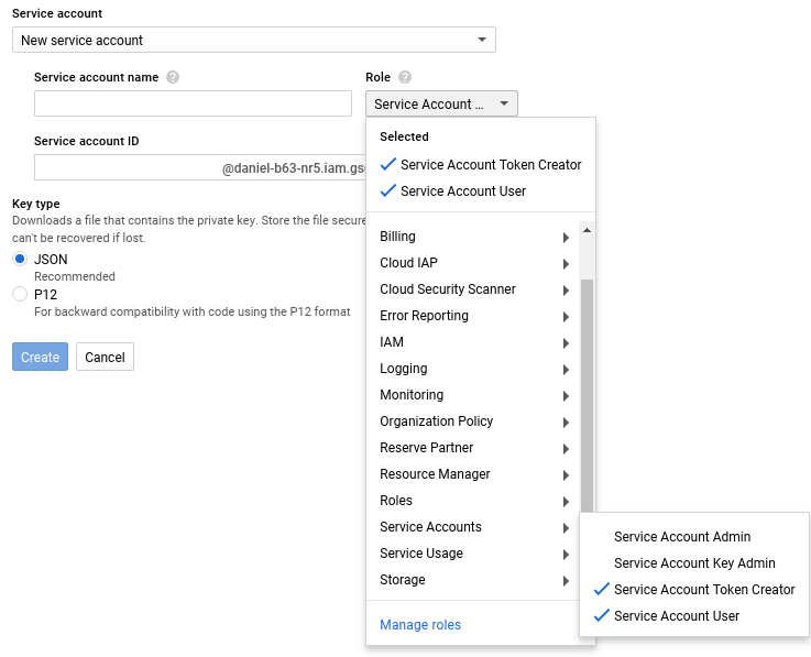 Created attachment 9624 [details] role selection https://cloud.google.com/iam/docs/service-accounts says Rolle "Dienstkontonutzer" Diese Rolle wurde eingestellt. Wenn Sie Vorgänge mit einem Dienstkonto ausführen müssen, verwenden Sie die Rolle Dienstkontobenutzer. Um gewissermaßen dieselben Berechtigungen wie für "Dienstkontonutzer" (Service Account Actor) zu erteilen, sollten Sie auch die Rolle Ersteller von Dienstkonto-Token zuweisen. I selected the roles in the attached screenshot. Please recreate the images with your toolchain, thanks.