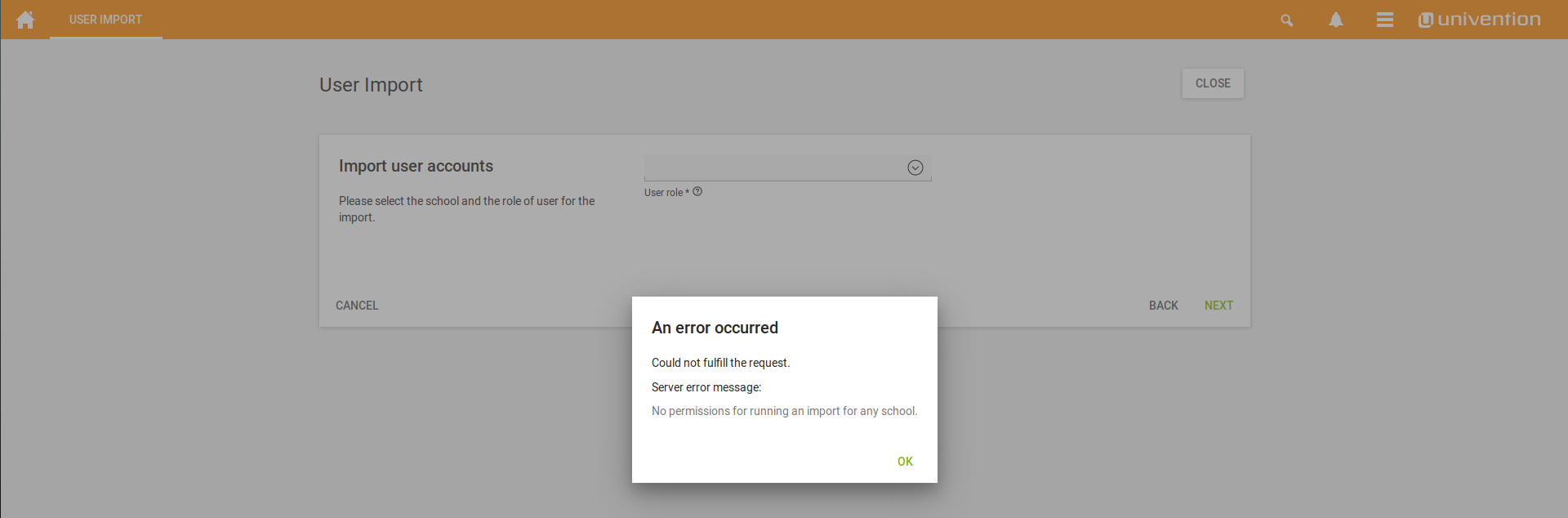 Created attachment 9687 [details] User import error pop-up "No permissions for running an import for any school." Not sure if this is the correct component, feel free to change if not. I've set up a DC master on 4.3-0, upgraded to 4.3-1, installed UCS@school, upgraded to 4.3-2 and installed the new import module: univention-install ucs-school-import-http-api univention-install ucs-school-umc-import univention-remove ucs-school-umc-csv-import When I access the User import module in the UMC I get an error pop-up (see attachment): An error occurred Could not fulfill the request. Server error message: No permissions for running an import for any school.