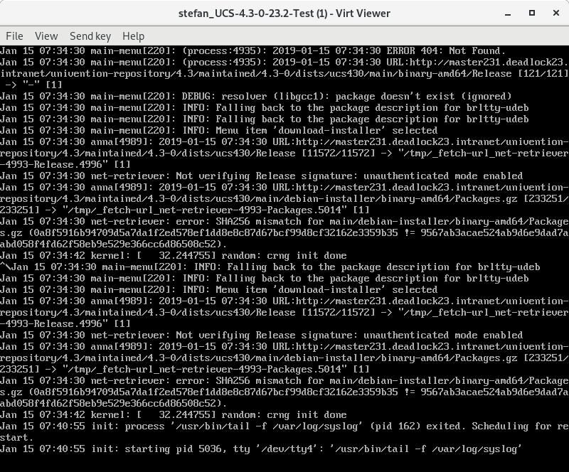 (In reply to Stefan Gohmann from comment #3) > I've updated my test machine with univention-updater (13.0.1-69) and > apt-mirror (0.5.4-1A~4.3.0.201901041140). Afterwards, I've executed > 'univention-repository-update net' and started the PXE installation of a > test system. The Debian component "main/debian-mirror" was not mirrored. That is added to "/etc/apt/mirror.list" now, too. code @ "git:phahn/46600-pxe" deb @ "deb [trusted=yes] http://10.200.18.180/debian/ phahn46600-pxe main" PS: You can use my "toolshed/REPO/repo-check-Release-valid" to make sure the Release files are valid, e.g. correct hash sums, signatures, .... I use it before each UCS Release: /usr/local/bin/repo-check-Release-valid /var/lib/univention-repository/mirror PPS: Your VM was successfully installed. For verification I added the following hunk to your VM and used "Esc" to boot into the VM: <domain ...> <os> ... <bootmenu enable='yes' timeout='3000'/> </os> ... </domain>
