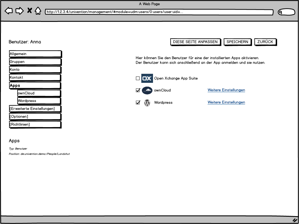 Created attachment 9829 [details] Mock Up The users/user view should have a tab which shows a checkbox for every available app and to activate users for this app. See attachment for a mock up.