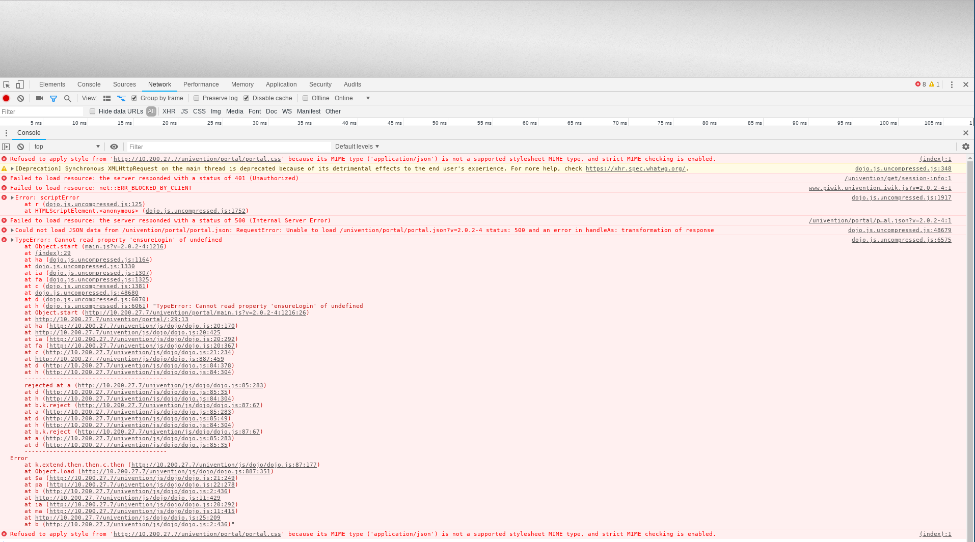 Created attachment 9895 [details] Screenshot Refused to apply style from 'http://10.200.27.7/univention/portal/portal.css' because its MIME type ('application/json') is not a supported stylesheet MIME type, and strict MIME checking is enabled. dojo.js.uncompressed.js:348 [Deprecation] Synchronous XMLHttpRequest on the main thread is deprecated because of its detrimental effects to the end user's experience. For more help, check https://xhr.spec.whatwg.org/. /univention/get/session-info:1 Failed to load resource: the server responded with a status of 401 (Unauthorized) www.piwik.univention…iwik.js?v=2.0.2-4:1 Failed to load resource: net::ERR_BLOCKED_BY_CLIENT dojo.js.uncompressed.js:1917 Error: scriptError at r (dojo.js.uncompressed.js:125) at HTMLScriptElement.<anonymous> (dojo.js.uncompressed.js:1752) /univention/portal/p…al.json?v=2.0.2-4:1 Failed to load resource: the server responded with a status of 500 (Internal Server Error) dojo.js.uncompressed.js:48679 Could not load JSON data from /univention/portal/portal.json: RequestError: Unable to load /univention/portal/portal.json?v=2.0.2-4 status: 500 and an error in handleAs: transformation of response dojo.js.uncompressed.js:6575 TypeError: Cannot read property 'ensureLogin' of undefined at Object.start (main.js?v=2.0.2-4:1216) at (index):29 at ha (dojo.js.uncompressed.js:1164) at dojo.js.uncompressed.js:1330 at ia (dojo.js.uncompressed.js:1307) at fa (dojo.js.uncompressed.js:1325) at c (dojo.js.uncompressed.js:1381) at dojo.js.uncompressed.js:48680 at d (dojo.js.uncompressed.js:6070) at h (dojo.js.uncompressed.js:6061) "TypeError: Cannot read property 'ensureLogin' of undefined at Object.start (http://10.200.27.7/univention/portal/main.js?v=2.0.2-4:1216:26) at http://10.200.27.7/univention/portal/:29:13 at ha (http://10.200.27.7/univention/js/dojo/dojo.js:20:170) at http://10.200.27.7/univention/js/dojo/dojo.js:20:425 at ia (http://10.200.27.7/univention/js/dojo/dojo.js:20:292) at fa (http://10.200.27.7/univention/js/dojo/dojo.js:20:367) at c (http://10.200.27.7/univention/js/dojo/dojo.js:21:234) at http://10.200.27.7/univention/js/dojo/dojo.js:887:459 at d (http://10.200.27.7/univention/js/dojo/dojo.js:84:378) at h (http://10.200.27.7/univention/js/dojo/dojo.js:84:304) ---------------------------------------- rejected at a (http://10.200.27.7/univention/js/dojo/dojo.js:85:283) at d (http://10.200.27.7/univention/js/dojo/dojo.js:85:35) at h (http://10.200.27.7/univention/js/dojo/dojo.js:84:304) at b.k.reject (http://10.200.27.7/univention/js/dojo/dojo.js:87:67) at a (http://10.200.27.7/univention/js/dojo/dojo.js:85:283) at d (http://10.200.27.7/univention/js/dojo/dojo.js:85:49) at h (http://10.200.27.7/univention/js/dojo/dojo.js:84:304) at b.k.reject (http://10.200.27.7/univention/js/dojo/dojo.js:87:67) at a (http://10.200.27.7/univention/js/dojo/dojo.js:85:283) at d (http://10.200.27.7/univention/js/dojo/dojo.js:85:35) ---------------------------------------- Error at k.extend.then.then.c.then (http://10.200.27.7/univention/js/dojo/dojo.js:87:177) at Object.load (http://10.200.27.7/univention/js/dojo/dojo.js:887:351) at $a (http://10.200.27.7/univention/js/dojo/dojo.js:21:249) at pa (http://10.200.27.7/univention/js/dojo/dojo.js:22:278) at b (http://10.200.27.7/univention/js/dojo/dojo.js:2:436) at http://10.200.27.7/univention/js/dojo/dojo.js:11:429 at ia (http://10.200.27.7/univention/js/dojo/dojo.js:20:292) at ma (http://10.200.27.7/univention/js/dojo/dojo.js:11:415) at http://10.200.27.7/univention/js/dojo/dojo.js:25:209 at b (http://10.200.27.7/univention/js/dojo/dojo.js:2:436)" (index):1 Refused to apply style from 'http://10.200.27.7/univention/portal/portal.css' because its MIME type ('application/json') is not a supported stylesheet MIME type, and strict MIME checking is enabled.
