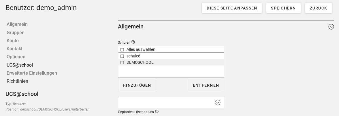 REOPEN: You are missing that container/ou etc. are not providing a lookup_filter() method! Therefore the new syntax class causes an warning message each time: 02.05.19 14:37:34.462 MODULE ( WARN ) : Syntax ucsschoolSchools wants to get optimizations but may not. This is a Bug! We provide a fallback but the syntax will respond much slower than it could! And even more fatal, and I was wondering why I didn't get the above error message, is that: Your changes are only in /usr/share/ucs-school-import/schema/syntax.ucs-school-import.py but not in /usr/share/pyshared/univention/admin/syntax.d/syntax.ucs-school-import.py. You have to re-execute the joinscript and register the latest file!