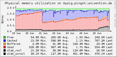 Created attachment 10090 [details] collectd: memory usage statistics A self-compiled 4.9.174 does not show the increasing memory usage after ½ day, but we need a longer look. Please note that swap still increases, so the bug might only be fixed partly: <http://xen1.knut.univention.de/collectd/bin/index.cgi?hostname=mysig.pingst.univention.de&plugin=memory&plugin=swap×pan=86400&action=show_selection&ok_button=OK> I filed a Debian bug for this: <https://bugs.debian.org/cgi-bin/bugreport.cgi?bug=931111>