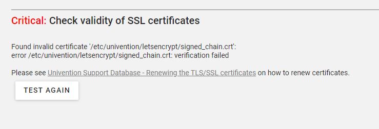 Created attachment 10586 [details] System diagnostic error message System diagnostic suddenly gives me: Found invalid certificate ‘/etc/univention/letsencrypt/signed_chain.crt’ (see attachment). Regarding to the UCS forum it seems that also other costumers are affected by this: https://help.univention.com/t/system-diagnostic-suddenly-gives-me-found-invalid-certificate-etc-univention-letsencrypt-signed-chain-crt/16797 when I check the last valid certificate (from Dec. 1st) on my system I get: openssl verify signed_chain.crt_20201201-033135 signed_chain.crt_20201201-033135: OK When I do the same check on the new created certificate (from Jan. 1st) I get: openssl verify signed_chain.crt CN = remote.xxxxx.de error 20 at 0 depth lookup: unable to get local issuer certificate error signed_chain.crt: verification failed Running “update-ca-certificates” doesnt fix the issue. My current workarround is to use the last valid certificate from Dec. 1st. But this workarround wont last very long...