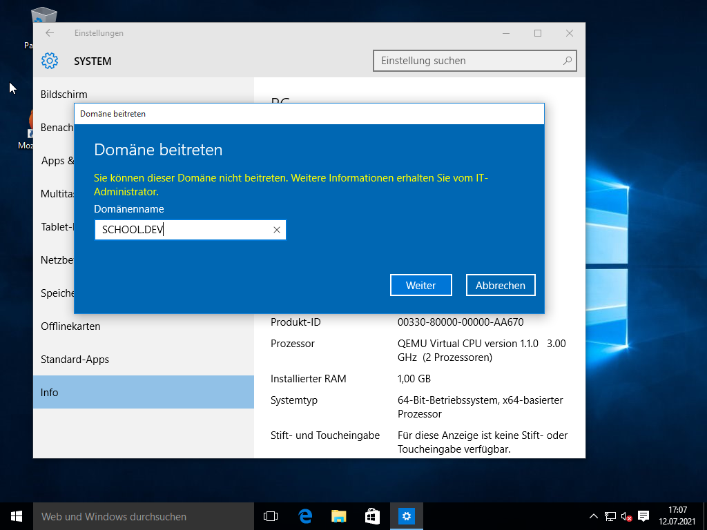 Created attachment 10775 [details] Screenshot When trying to join a Windows 10 client, which doesn't have an object yet in LDAP an exception is raised in the selective-udm module. The join doesn't succeed then, Windows doesn't show any information except for a message to ask the Administrator for help. Traceback (most recent call last): File "/usr/lib/python2.7/dist-packages/univention/management/console/base.py", line 344, in __error_handling six.reraise(etype, exc, etraceback) File "/usr/lib/python2.7/dist-packages/univention/management/console/base.py", line 247, in execute function.__func__(self, request, *args, **kwargs) File "/usr/lib/python2.7/dist-packages/univention/management/console/modules/decorators.py", line 181, in _response return function(self, request) File "/usr/lib/python2.7/dist-packages/ucsschool/lib/school_umc_ldap_connection.py", line 155, in wrapper_func return func(*args, **kwargs) File "/usr/lib/python2.7/dist-packages/univention/management/console/modules/selective-udm/__init__.py", line 96, in create_windows_computer self._check_usersid_join_permissions(ldap_user_read, request.options.get("usersid")) File "/usr/lib/python2.7/dist-packages/univention/management/console/modules/selective-udm/__init__.py", line 63, in _check_usersid_join_permissions result = lo.searchDn(ldap.filter.filter_format("sambaSID=%s", [usersid])) File "/usr/lib/python2.7/dist-packages/univention/admin/uldap.py", line 725, in searchDn raise univention.admin.uexceptions.ldapError(_err2str(msg), original_exception=msg) ldapError: Insufficient access Doesn't work with python2 and python3. Workaround is: diff --git univention-management-console-module-selective-udm/umc/python/selective-udm/__init__.py univention-management-console-module-selective-udm/umc/python/selective-udm/__init__.py index 6f44ce522..c87abc978 100644 --- univention-management-console-module-selective-udm/umc/python/selective-udm/__init__.py +++ univention-management-console-module-selective-udm/umc/python/selective-udm/__init__.py @@ -93,7 +93,7 @@ class Instance(SchoolBaseModule): # Set new position ldap_position.setDn(search_base.computers) - self._check_usersid_join_permissions(ldap_user_read, request.options.get("usersid")) + #self._check_usersid_join_permissions(ldap_user_read, request.options.get("usersid")) # TODO: univention.admin.modules.init() # Create the computer account I think I never saw this exception for a search request: 63 result = lo.searchDn(ldap.filter.filter_format("sambaSID=%s", [usersid])) lo is a "ldap_user_read" connection (in this case just the machine account connection to localhost). Can we also cause that Windows shows a custom error message about the failing join?